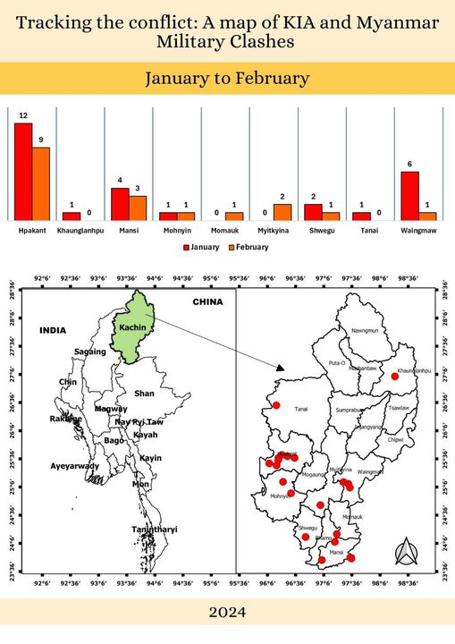 ၂၀၂၄ ခုနှစ် ဇန်နဝါလ နှင့် ဖေဖော်ဝါရီလ အတွင်းတွင် ကချင်ပြည်နယ်၌ စစ်ကောင်စီတပ်နှင့် ပြည်သူ့စစ်ပူပေါင်းတပ်တို့ကတစ်ဖက် ကချင်လွတ်လပ်ရေးတပ်မတော် (KIA)တပ် နှင့် PDF ပူးပေါင်းတပ်တို့ တစ်ဖက် တိုက်ပွဲပေါင်း (၄၅)ကြိမ်ဖြစ်ပွားခဲ့ပါသည်။